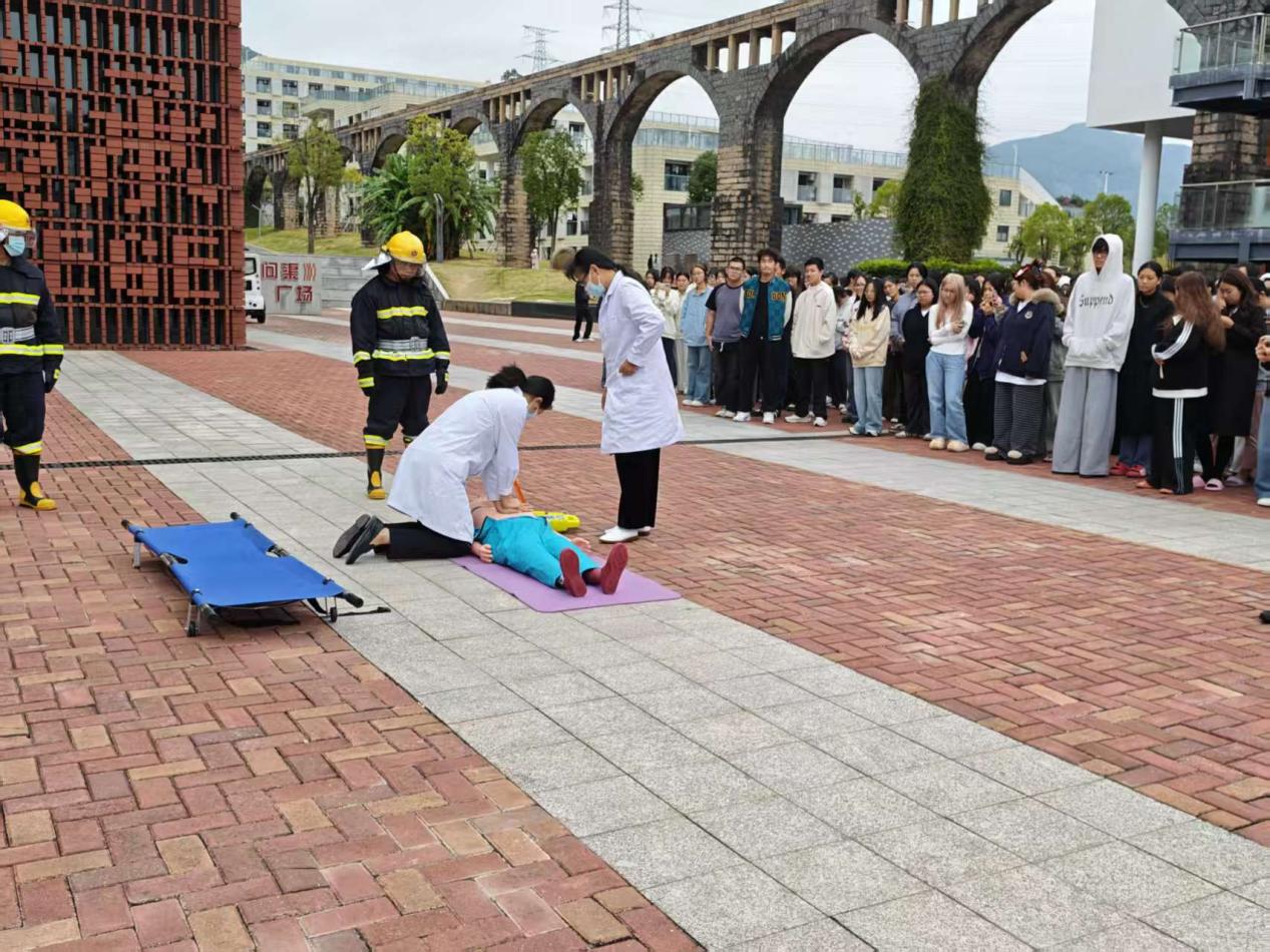 警报响起后,演练正式启动。应急疏散组按预定路线引导师生撤离,师生捂住口鼻、俯首前行,避开拥挤踩踏风险。医疗救护组同步开展人员搜救、伤口包扎、心肺复苏等实操救援,灭火保障组在墨香广场完成初火扑灭展示。
