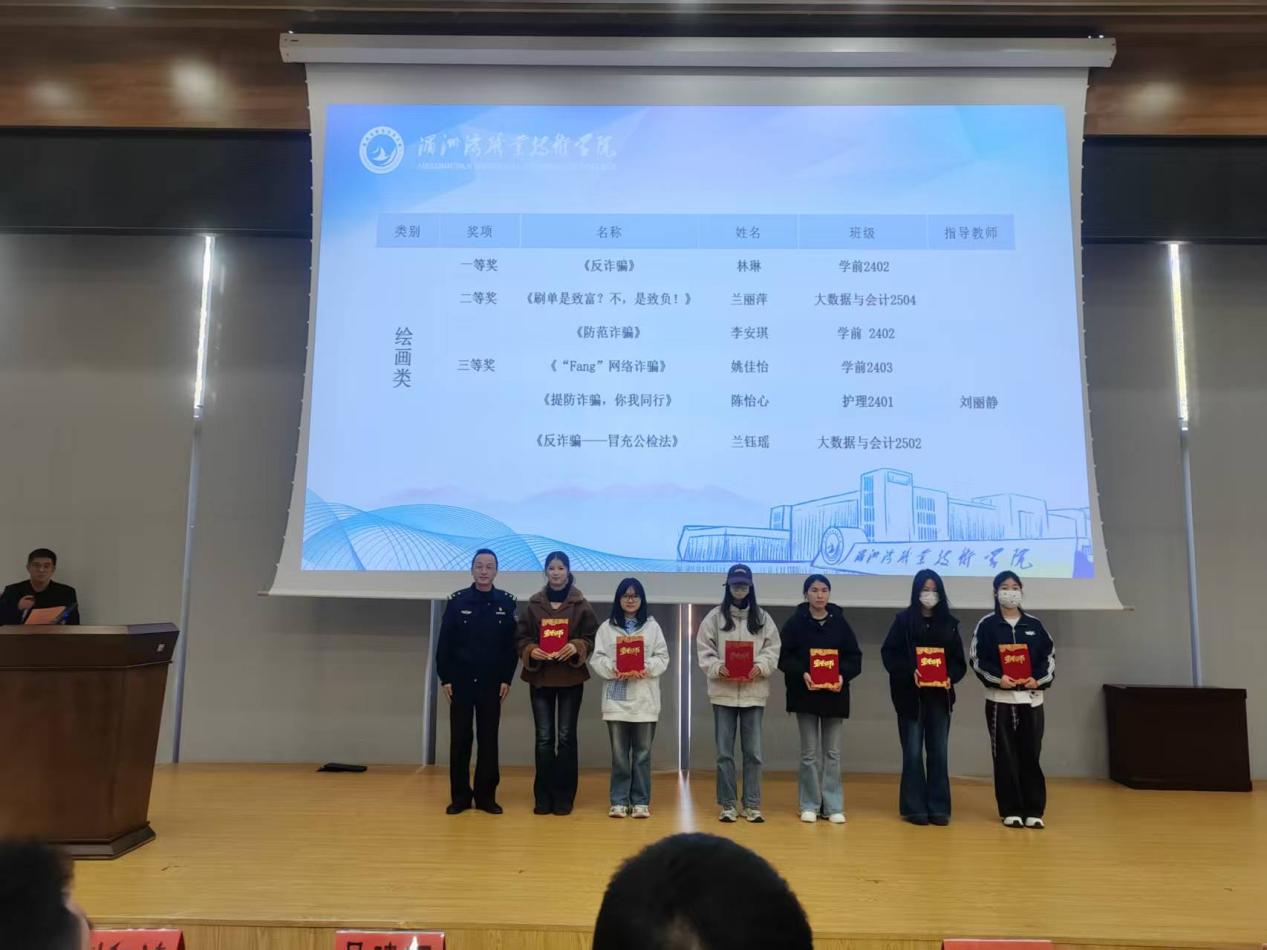 与会领导为获得“反诈是门必修课 筑牢防线守好责”主题反诈创作大赛一、二、三等奖的同学代表颁发奖状并合影留念。